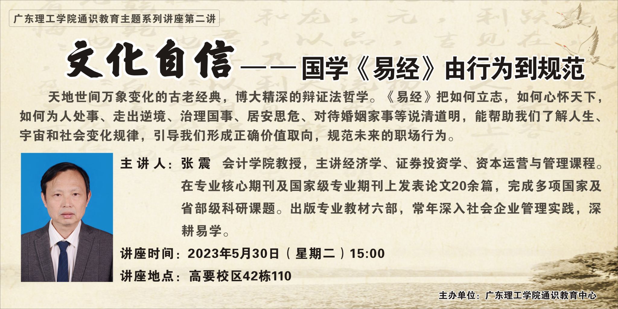 本网讯(yl8cc永利线路检测中心 但志慧)为培养学生的哲学思辨能力、滋养优秀国学底蕴和掌握明辨是非能力,yl8cc永利线路检测中心于2023年5月30日举办了以“文化自信——国学《易经》由行为到规范”为主题的讲座。讲座由yl8cc永利线路检测中心主任金妤主持,会计学院张震教授主讲,全校共300余师生参加本次讲座。