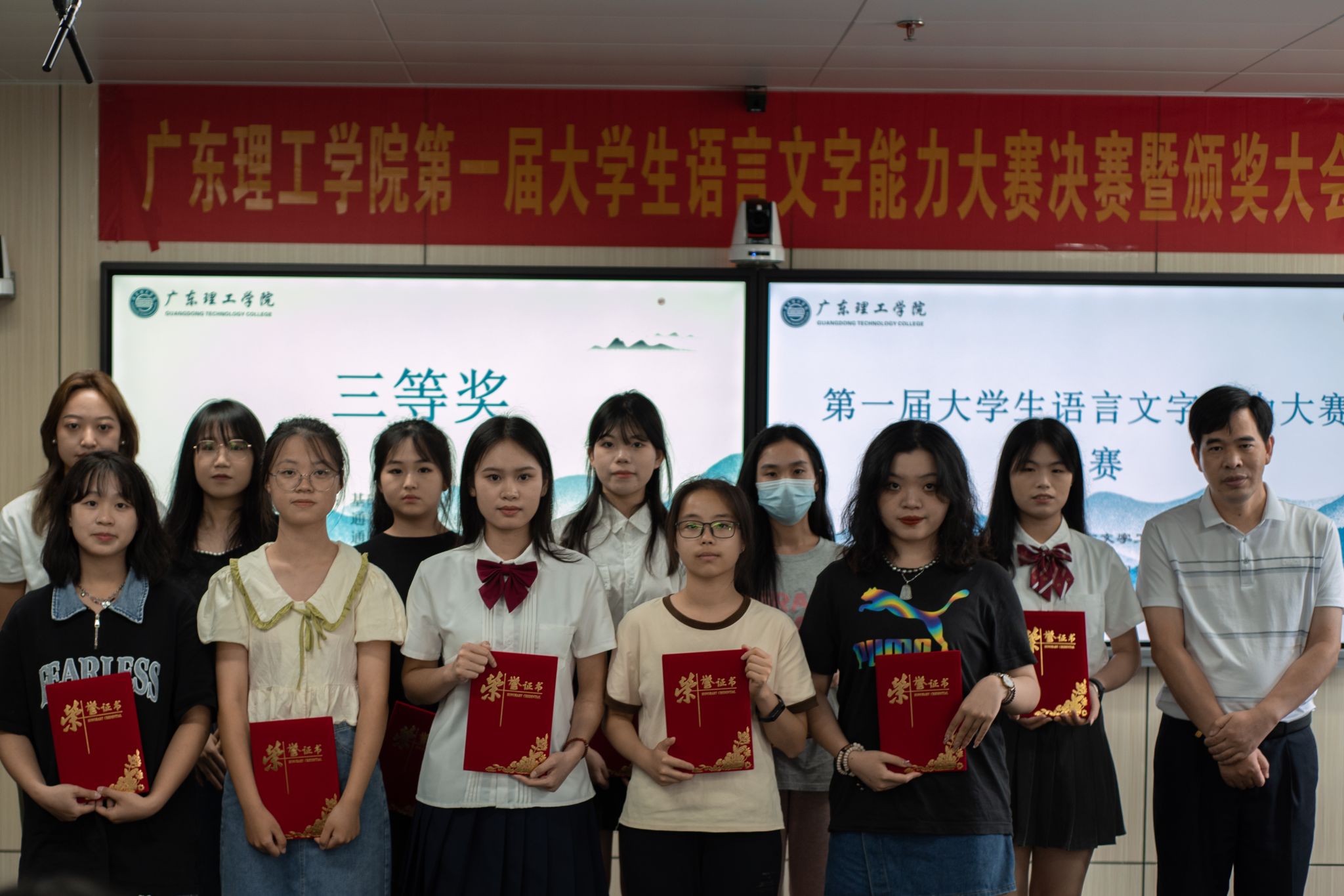 基础部副教授蔡星灿、yl8cc永利线路检测中心教师骆叶和刘安琪为二等奖选手颁奖并合影留恋