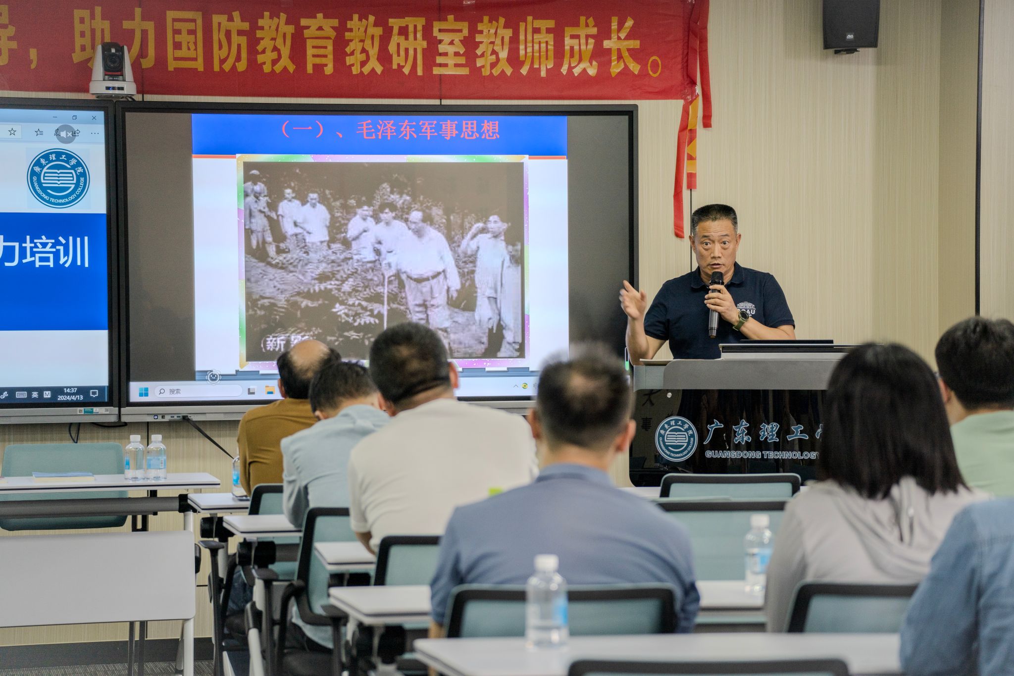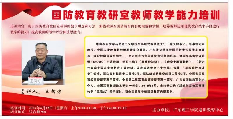 本网讯 (yl8cc永利线路检测中心 江天歌)为深化我校国防教育教研室教师的教学理念与教学方法,增进教师对国防教育内容的把握与应用,yl8cc永利线路检测中心于4月13日开展了国防教育教研室教师教学能力培训。本次培训由华南农业大学王向方教授主讲,全体授课教师及相关教务管理人员参与了此次的培训并与王教授共同探讨了国防教育的深化发展。