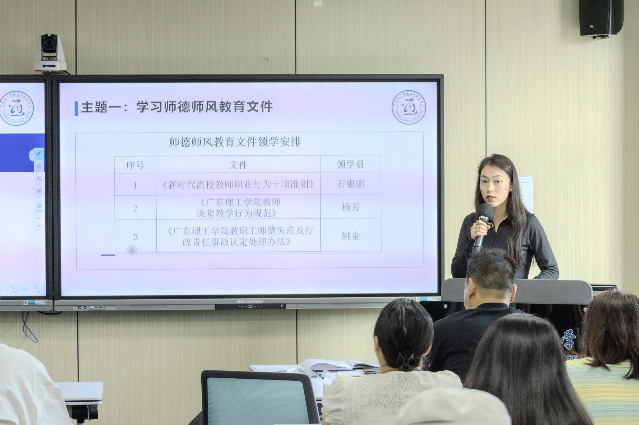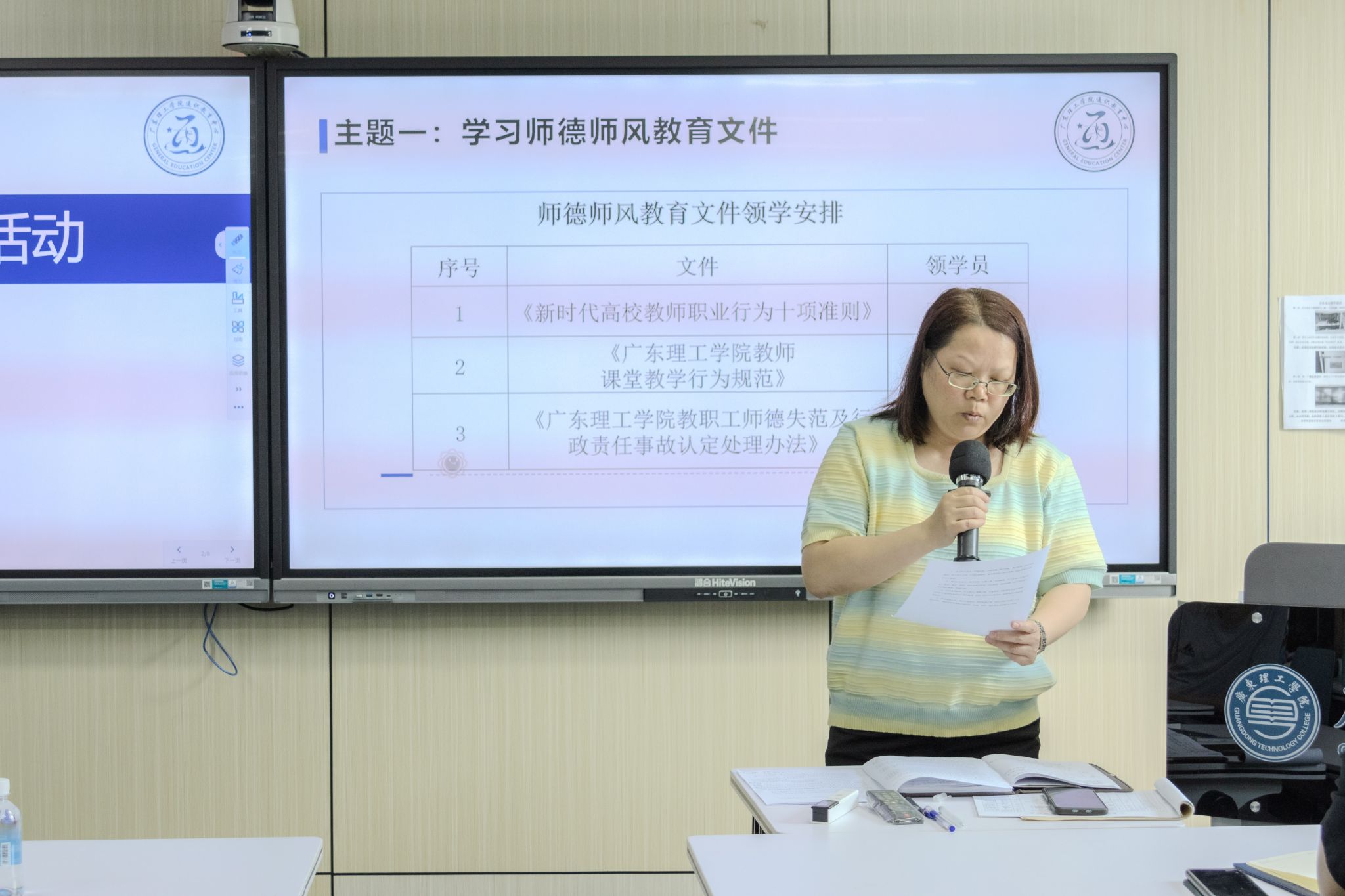 活动伊始,中心石银丽书记率先领学《新时代高校教师职业行为十项准则》,深入解读准则内涵,强调新时代教师应坚守的职业道德底线与行为规范。杨芳老师则对《广东理工学院教师课堂教学行为规范》进行细致讲解,从教学准备、教学过程到教学评价,全方位规范教师课堂教学行为。姚金老师领学《广东理工学院教职工师德失范及行政责任事故认定处理办法》,以案例警示全体教师,明确师德失范行为的严重后果,为教师们敲响警钟。